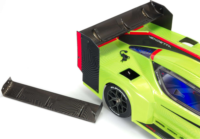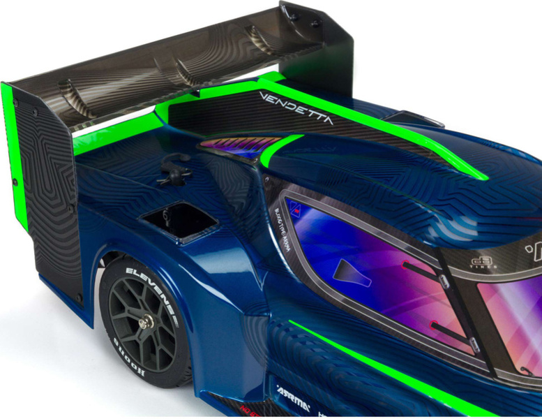 Die aerodynamisch abgestimmte Karosserie des VENDETTA™ Speed Racer verfügt über einen stabilen Anpressflügel mit hohem und niedrigem Anpressdruck. Sie ist in einer werkseitig fertiggestellten Ausführung mit erstaunlichem mattem oder glänzendem grünen oder blauen Lack mit Aufklebern erhältlich.