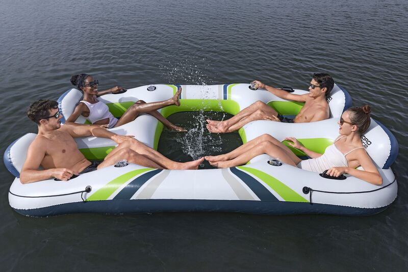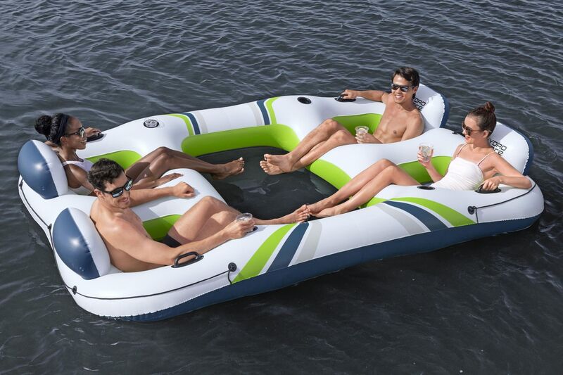 Die aufblasbare Insel mit den Maßen 291x202x51 cm ist für eine bequeme Entspannung auf dem Wasser in Gesellschaft von bis zu vier Personen gedacht.