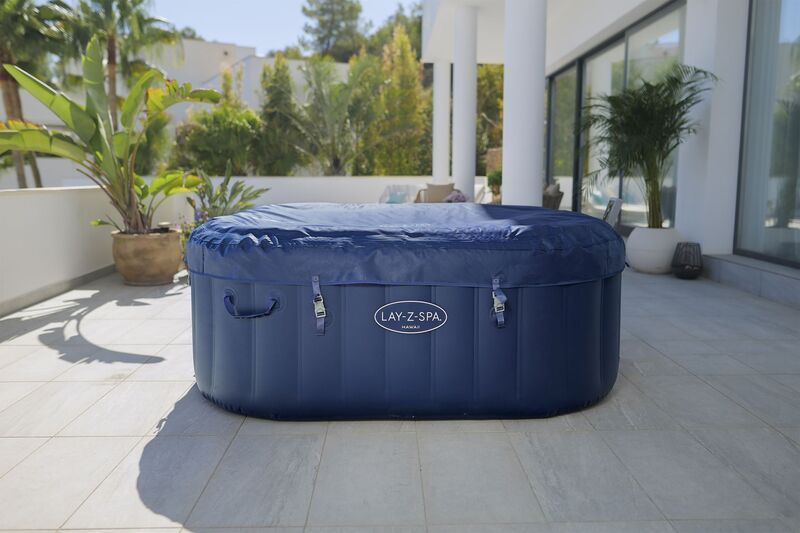 Der energieeffiziente Whirlpool Bestway® LAY-Z-SPA® Hawaii AirJet™ wird mit einem 2-teiligen Isolier-Thermocover, einem Chemikalien-Dosierer ChemConnect®, einer Filterkartusche (Größe VI) und zwei Reparaturflicken geliefert.