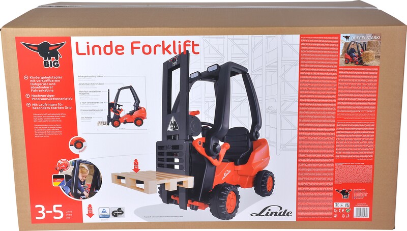 Der große Gabelstapler Linde Forklift von der renommierten Marke BIG ist ein großartiger Spaß, der Ihrem Kind ein super Erlebnis bietet. Ihr Kind wird sich fühlen, als wäre es in einem echten Stapler. Die beweglichen Gabeln, auf denen eine Ladung, z.B. die beiliegende Palette, platziert werden kann, machen das Produkt sehr realistisch und interessant.