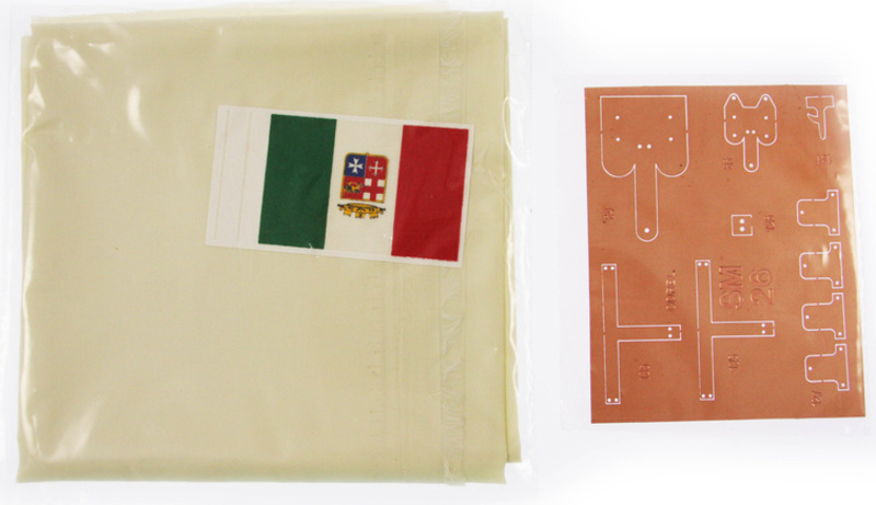 Die Verpackung enthält ein Set von Sperrholzteilen, ein Set von Holzleisten mit unterschiedlichen Querschnitten, einen Blister mit kleinen Teilen, Teile aus Messing, einen Satz Zeichnungen und ein mehrsprachiges Handbuch.