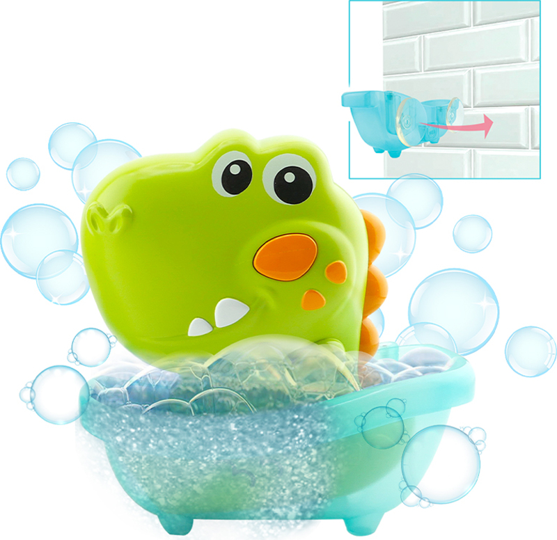 Befestigen Sie das Spielzeug mit Saugnäpfen an der Wand der Badewanne oder Dusche, gießen Sie Badewasser in die Dinus-Wanne und starten Sie das Spielzeug. Der Seifenblasengenerator zaubert echten Schaum!