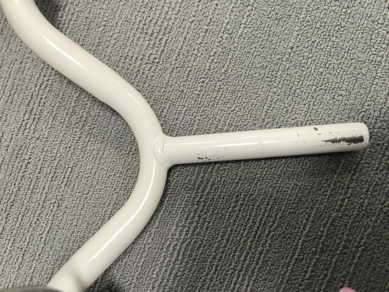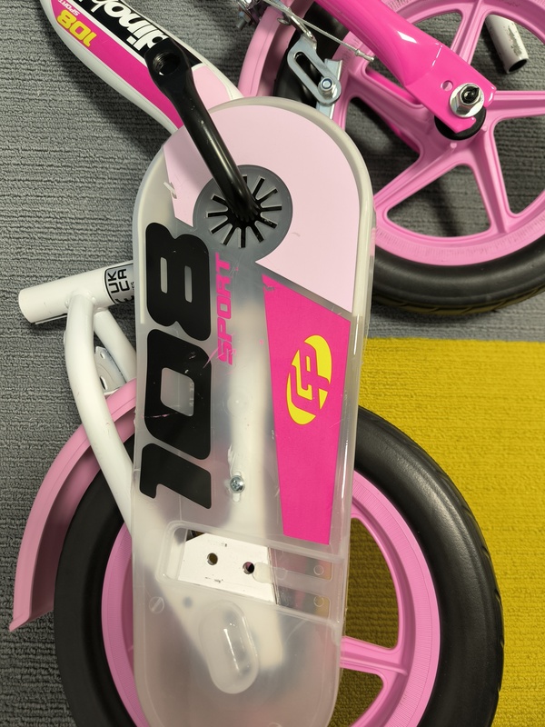 Das Kinderfahrrad ist an einigen Stellen abgeschürft und die Kettenabdeckung hat einen kleinen Riss.