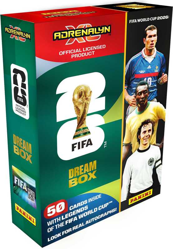 Sammlerkarten FIFA WORLD CUP 2026 - ADRENALYN - DREAM BOX. Die Verpackung enthält 50 Karten, darunter 25 Basis-Karten, 24 exklusive Legends FIFA World Cup-Karten und 1 Dream Box Momentum-Karte.Bereiten Sie sich auf das größte Fußballfest mit der exklusiven Dream Box aus der Sammlerserie Adrenalyn XL zur Weltmeisterschaft 2026 vor! Diese Premium-Box ist für echte Sammler konzipiert, die die größten Stars und legendären Spieler der FIFA-Geschichte in ihre Sammlung aufnehmen möchten.