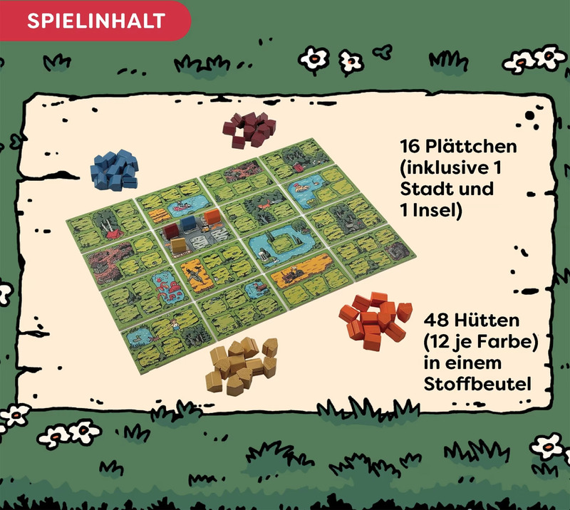 - Inhalt der Verpackung: 48 Hütten (12 in jeder Farbe) in einem Stoffbeutel, 16 Plättchen (einschließlich 1 Stadt und 1 Insel)
