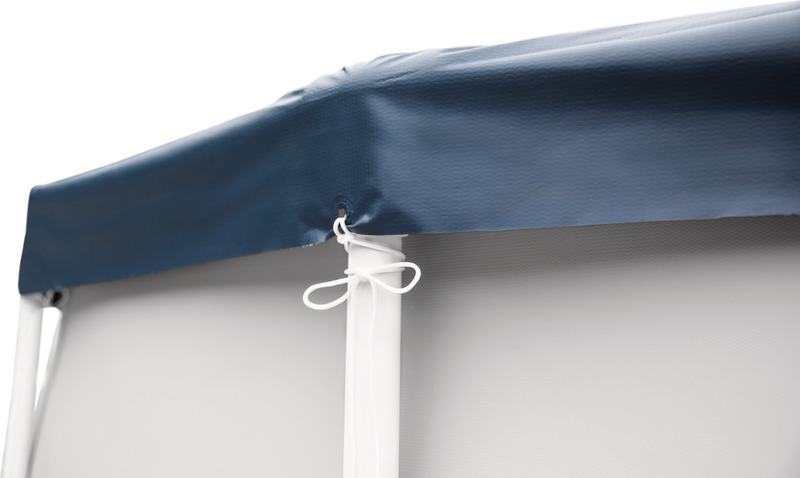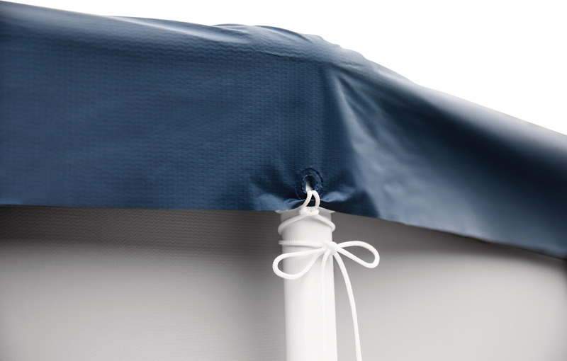 Die Plane verfügt über einen praktischen 20 cm Überstand, der das Aufziehen erleichtert und eine vollständige Abdeckung der Ränder gewährleistet. Damit die Abdeckung auch bei widrigen Wetterbedingungen stabil bleibt, ist sie mit einer festen Seilspannung ausgestattet, die sie sicher fixiert und verhindert, dass der Wind Schmutz unter die Plane bläst. Für maximalen Schutz während der Wintersaison empfiehlt der Hersteller die Kombination mit einem optionalen Winterkissen (separat erhältlich), das die Poolkonstruktion vor dem Druck von Frost und Schnee schützt.