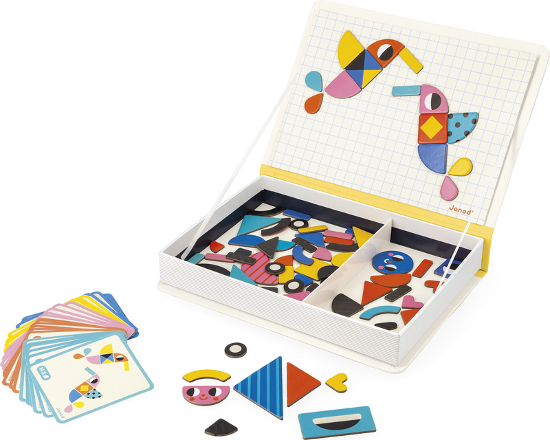 Einen Quadrat hier, zwei Rechtecke dort, drei Dreiecke hier... und schon haben Sie es – ein Boot! Dieses magnetische Spiel enthält 85 Magnete und 30 Karten.Das Ziel des Spiels ist es, die Bilder auf der Magnettafel gemäß den Vorlagen auf den Karten nachzubilden. Ihr Kind kann wunderschöne Vögel, Figuren oder sogar Fahrzeuge herstellen!