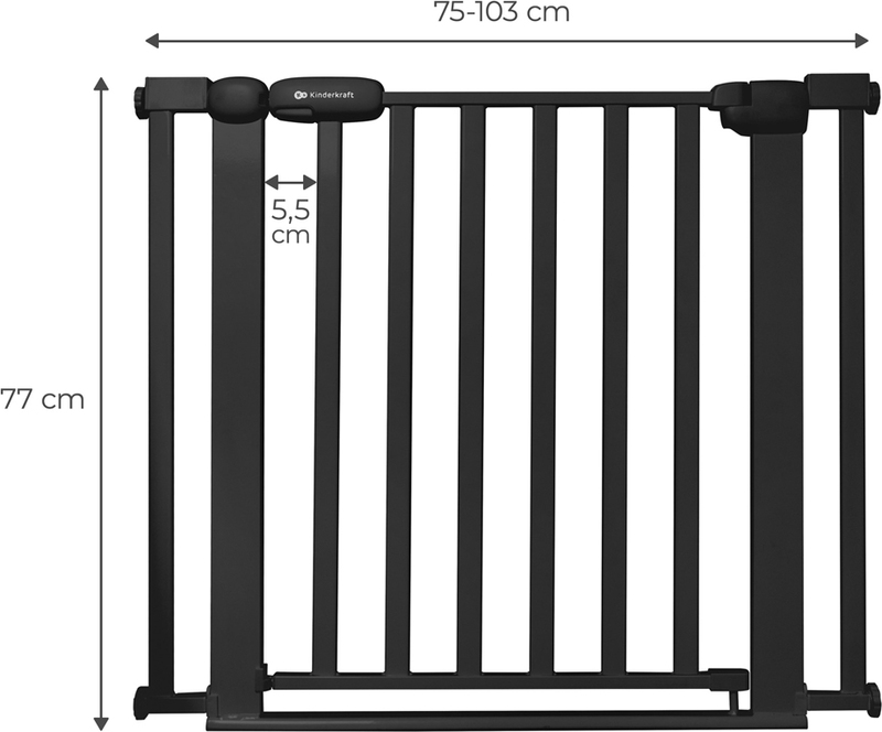 Die Barriere hat ein universelles Design und darüber hinaus können Sie sie auf eine Breite von 75 bis 103 cm einstellen. Sie passt zu jeder Tür und kann auch neben der Treppe oben oder unten montiert werden, damit Ihr Kind nicht alleine die Treppe hinuntergehen kann.