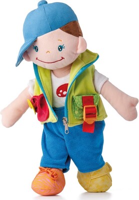 Die interaktive Puppe ist ein Haustier, aber auch ein pädagogischer Freund. Kinder entwickeln während des Spiels Feinmotorik. Alle Kleidungsstücke können ausgezogen werden, an den Beinen befindet sich ein Klettverschluss für wiederholtes Training. Auf der Tasche bei der Weste ist ein großer Holzknopf für das Befestigungstraining aufgenäht.