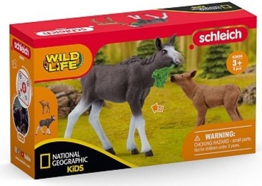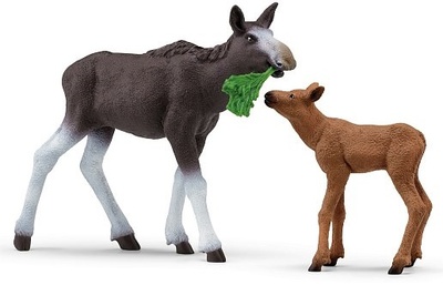 Ein eleganter Elch kümmert sich liebevoll um sein kleines Junges. Sie gibt ihm mehrmals am Tag Milch. Um ihre Kraft zu erhalten, muss sie eine große Menge frisches Gras fressen.