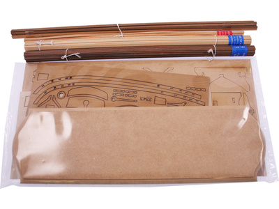 Nach dem Öffnen des Deckels der Box finden Sie die Holzteile des Modells aus Sperrholz, ein Set von Leisten, kleine Teile, die in einer transparenten Blisterverpackung eingeschlossen sind, einen Satz Zeichnungen und ein Handbuch.