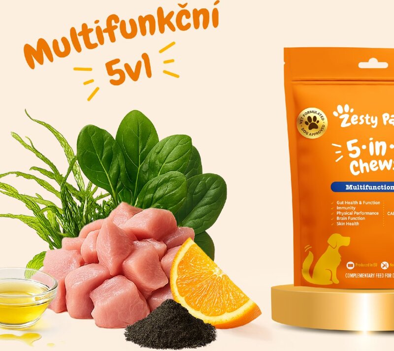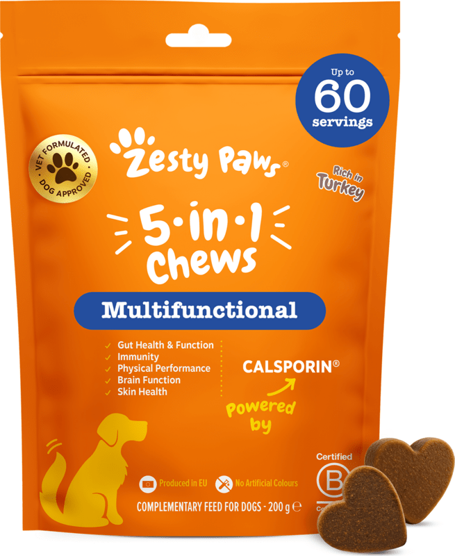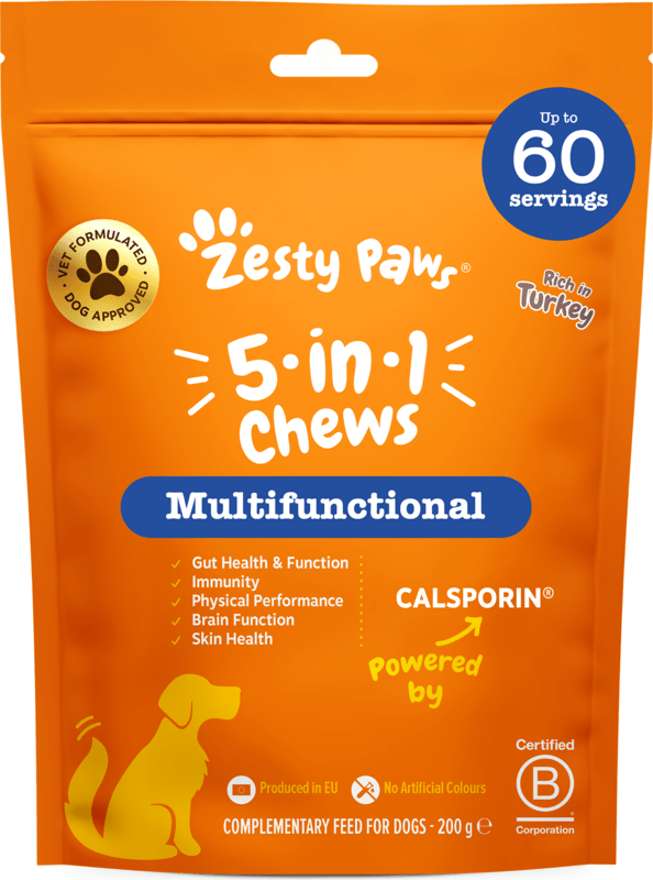 Unterstützen Sie die tägliche Vitalität und das Wohlbefinden Ihres Hundes mit Zesty Paws 5-in-1 Chews. Diese hochwertigen multifunktionalen Nahrungsergänzungsmittel für Hunde, entwickelt in Zusammenarbeit mit Tierärzten, vereinen großartigen Geschmack, spielerische Darreichungsform und sorgfältig ausgewählte Zutaten. Die funktionale Zusammensetzung mit dem patentierten Inhaltsstoff Calsporin® unterstützt die natürlichen Körperfunktionen – von der richtigen Funktion des Gehirns und des Immunsystems bis hin zum Gleichgewicht der Darmmikroflora, das mit gesunder Haut und der Aufrechterhaltung der körperlichen Fitness zusammenhängt.