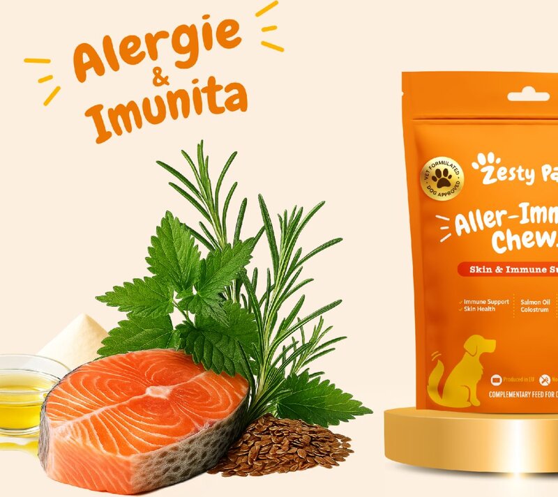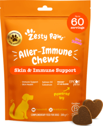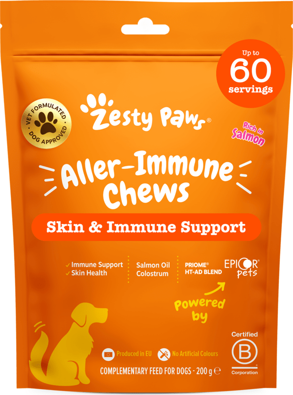 Unterstützen Sie das Immunsystem und das gesunde Erscheinungsbild der Haut Ihres Partners mit Zesty Paws Allergy & Immunity Chews. Diese hochwertigen FUNKTIONALEN Nahrungsergänzungsmittel für Hunde, entwickelt in Zusammenarbeit mit Tierärzten, vereinen großartigen Geschmack, spielerische Darreichungsform und sorgfältig ausgewählte Zutaten. Die funktionale Zusammensetzung mit patentierten Inhaltsstoffen EpiCor® Pets und PRIOME® HT-AD BLEND® unterstützt die natürliche Funktion des Immunsystems, fördert die Gesundheit von Haut und Fell und trägt zum Wohlbefinden von Hunden mit empfindlicher Haut und Juckreiz bei.